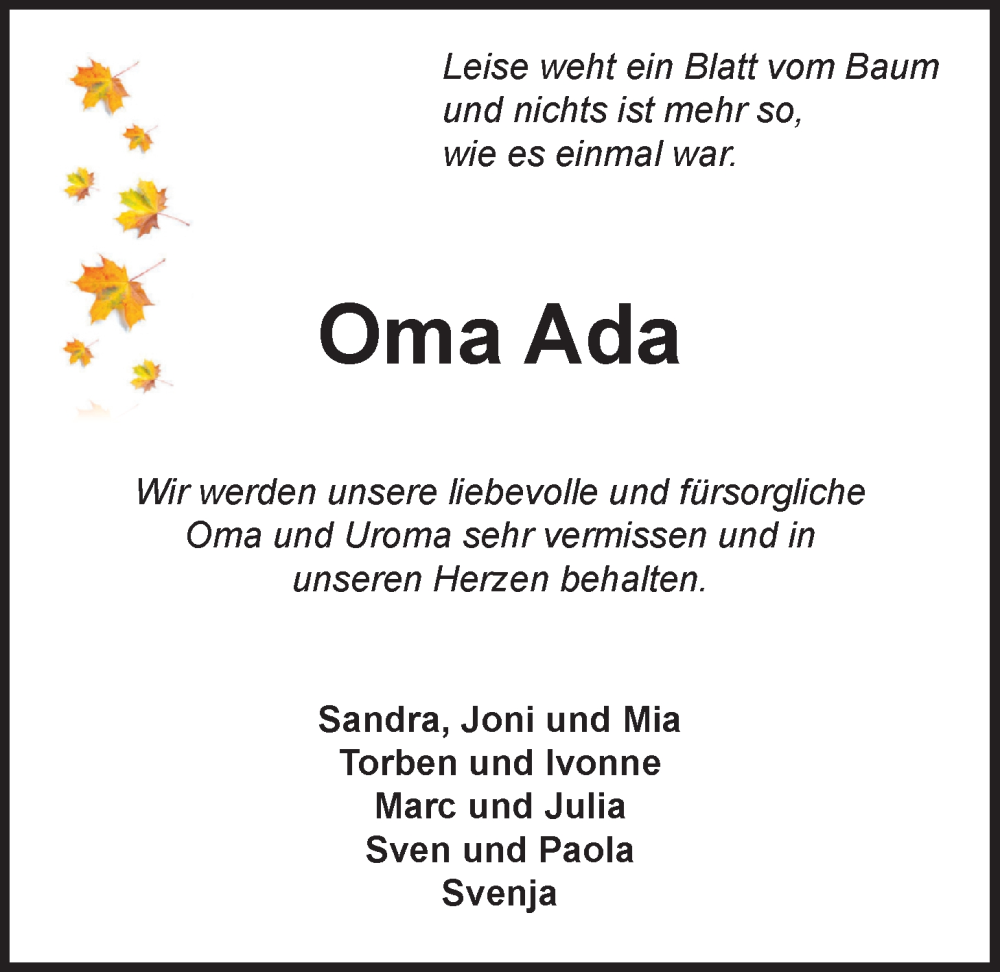 Hier finden Sie alle Traueranzeigen aus der Zeitung, die bisher für Ada Lüschen erschienen sind. Weitere Traueranzeigen, die in der Zeitung erscheinen, werden hier ebenfalls aufgelistet