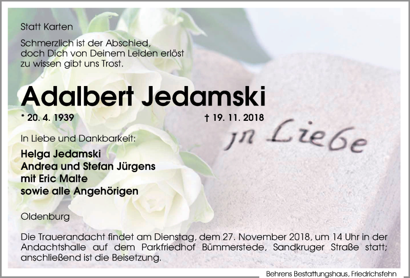 Hier finden Sie alle Traueranzeigen aus der Zeitung, die bisher für Adalbert Jedamski erschienen sind. Weitere Traueranzeigen, die in der Zeitung erscheinen, werden hier ebenfalls aufgelistet