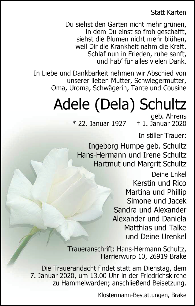Hier finden Sie alle Traueranzeigen aus der Zeitung, die bisher für Adele Schultz erschienen sind. Weitere Traueranzeigen, die in der Zeitung erscheinen, werden hier ebenfalls aufgelistet