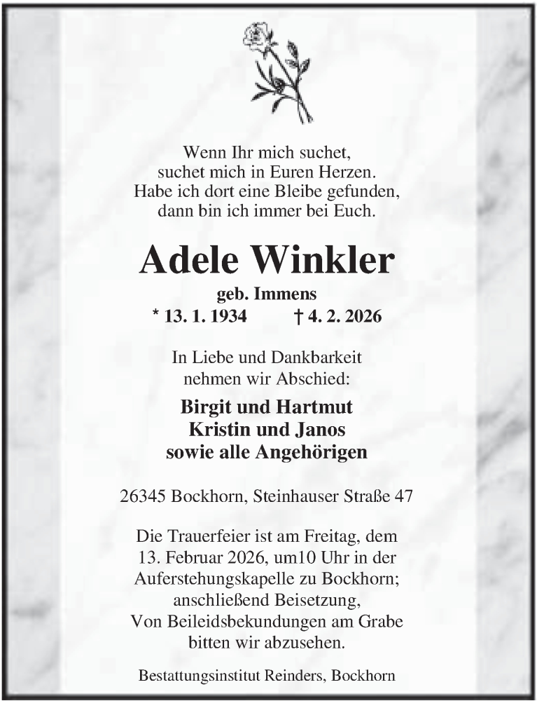 Hier finden Sie alle Traueranzeigen aus der Zeitung, die bisher für Adele Winkler erschienen sind. Weitere Traueranzeigen, die in der Zeitung erscheinen, werden hier ebenfalls aufgelistet