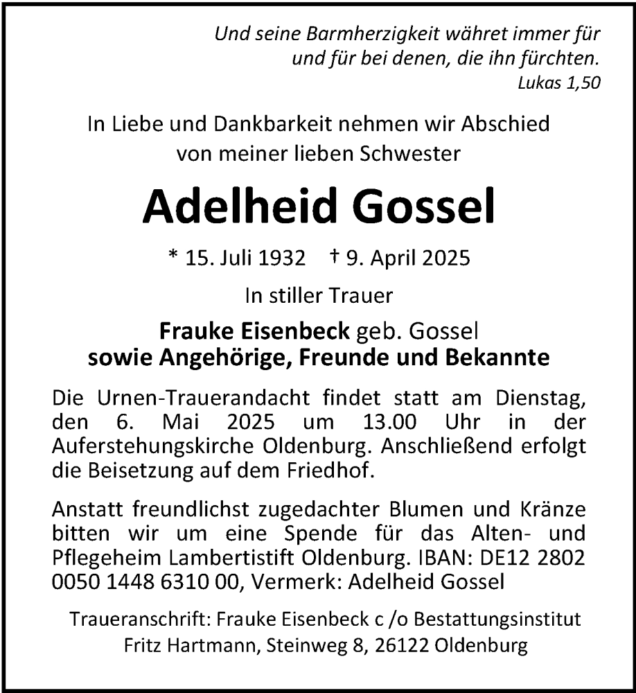 Hier finden Sie alle Traueranzeigen aus der Zeitung, die bisher für Adelheid Gossel erschienen sind. Weitere Traueranzeigen, die in der Zeitung erscheinen, werden hier ebenfalls aufgelistet