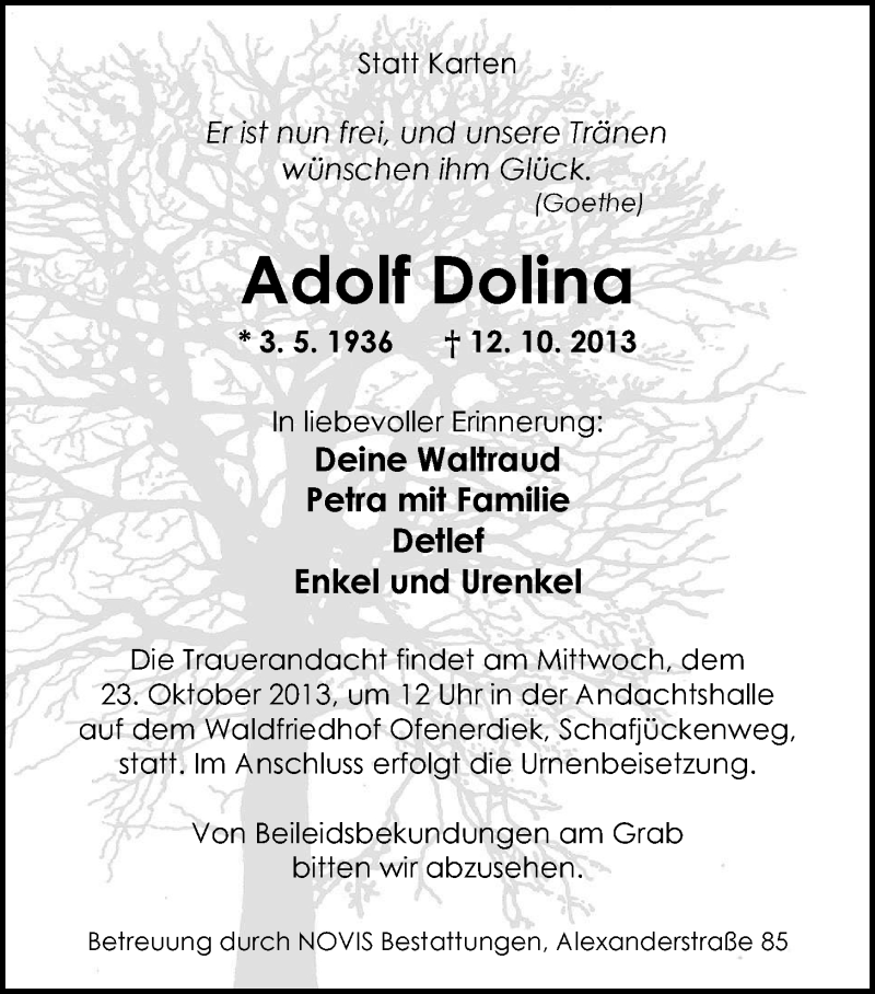 Hier finden Sie alle Traueranzeigen aus der Zeitung, die bisher für Adolf Dolina erschienen sind. Weitere Traueranzeigen, die in der Zeitung erscheinen, werden hier ebenfalls aufgelistet