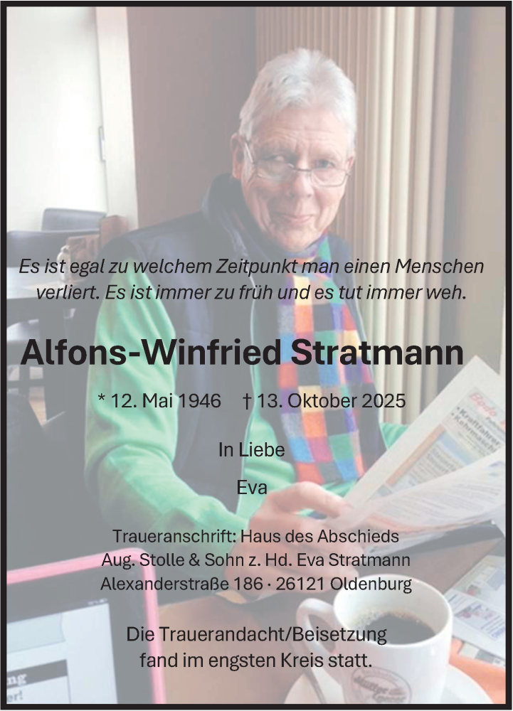 Hier finden Sie alle Traueranzeigen aus der Zeitung, die bisher für Alfons-Winfried Stratmann erschienen sind. Weitere Traueranzeigen, die in der Zeitung erscheinen, werden hier ebenfalls aufgelistet