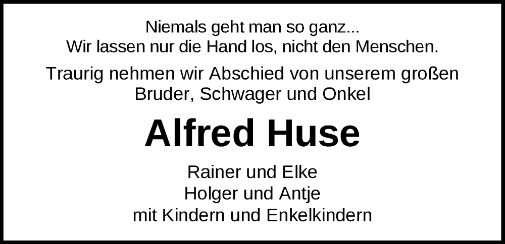 Hier finden Sie alle Traueranzeigen aus der Zeitung, die bisher für Alfred Huse erschienen sind. Weitere Traueranzeigen, die in der Zeitung erscheinen, werden hier ebenfalls aufgelistet