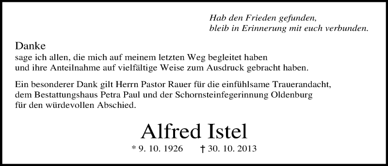 Hier finden Sie alle Traueranzeigen aus der Zeitung, die bisher für Alfred Istel erschienen sind. Weitere Traueranzeigen, die in der Zeitung erscheinen, werden hier ebenfalls aufgelistet