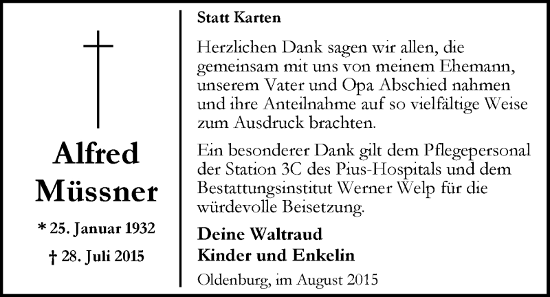 Hier finden Sie alle Traueranzeigen aus der Zeitung, die bisher für Alfred Müssner erschienen sind. Weitere Traueranzeigen, die in der Zeitung erscheinen, werden hier ebenfalls aufgelistet