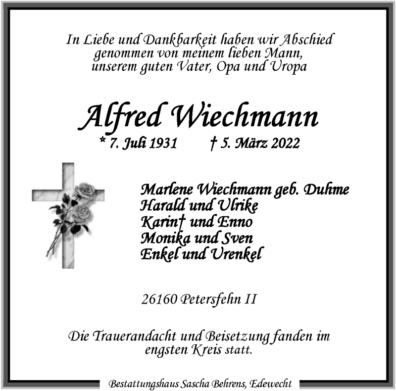 Hier finden Sie alle Traueranzeigen aus der Zeitung, die bisher für Alfred Wiechmann erschienen sind. Weitere Traueranzeigen, die in der Zeitung erscheinen, werden hier ebenfalls aufgelistet