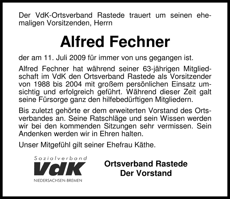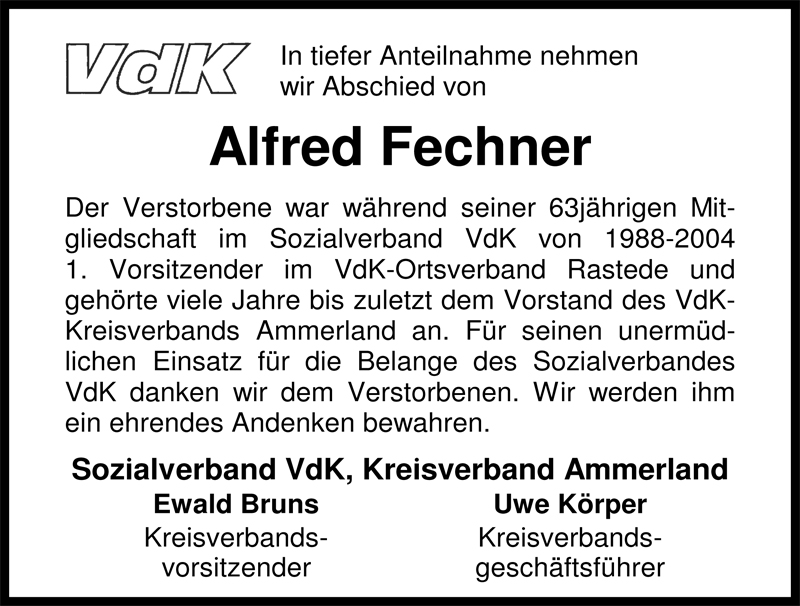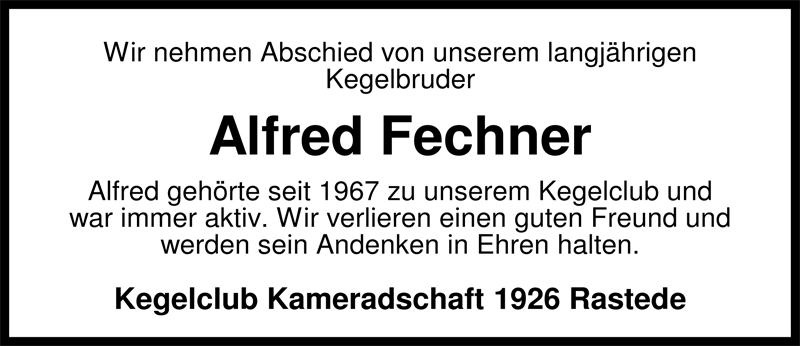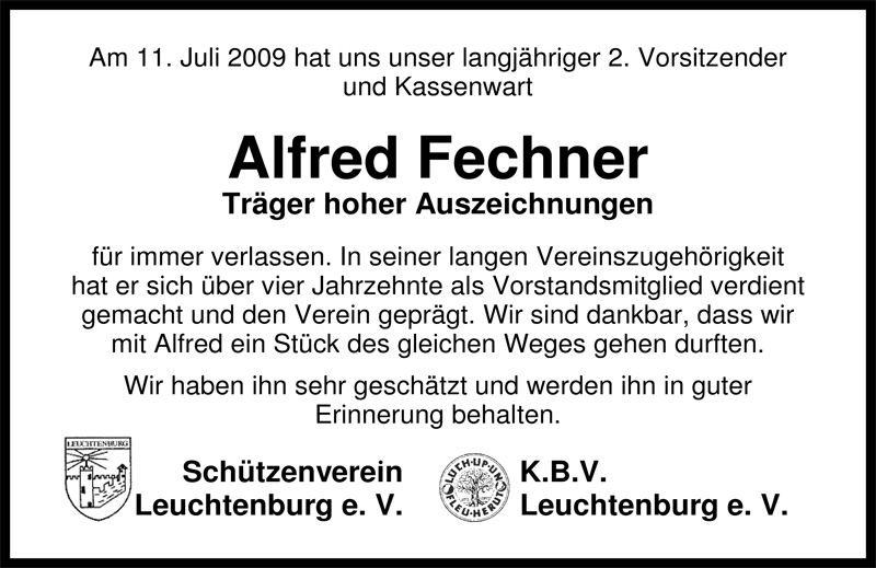 Hier finden Sie alle Traueranzeigen aus der Zeitung, die bisher für Alfred Fechner erschienen sind. Weitere Traueranzeigen, die in der Zeitung erscheinen, werden hier ebenfalls aufgelistet