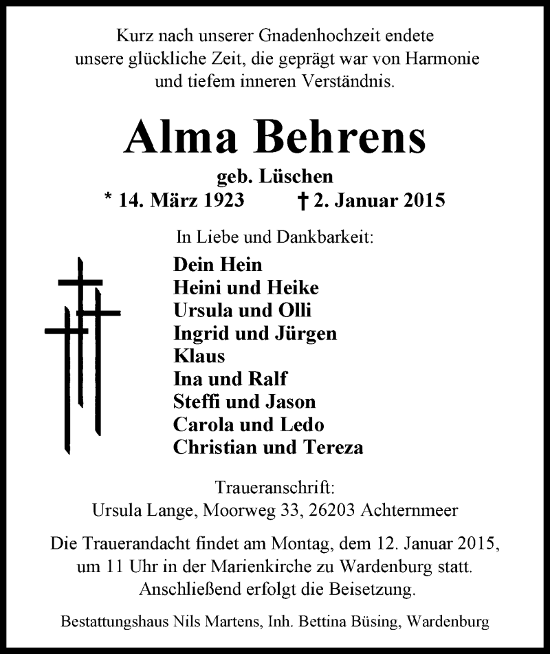Hier finden Sie alle Traueranzeigen aus der Zeitung, die bisher für Alma Behrens erschienen sind. Weitere Traueranzeigen, die in der Zeitung erscheinen, werden hier ebenfalls aufgelistet