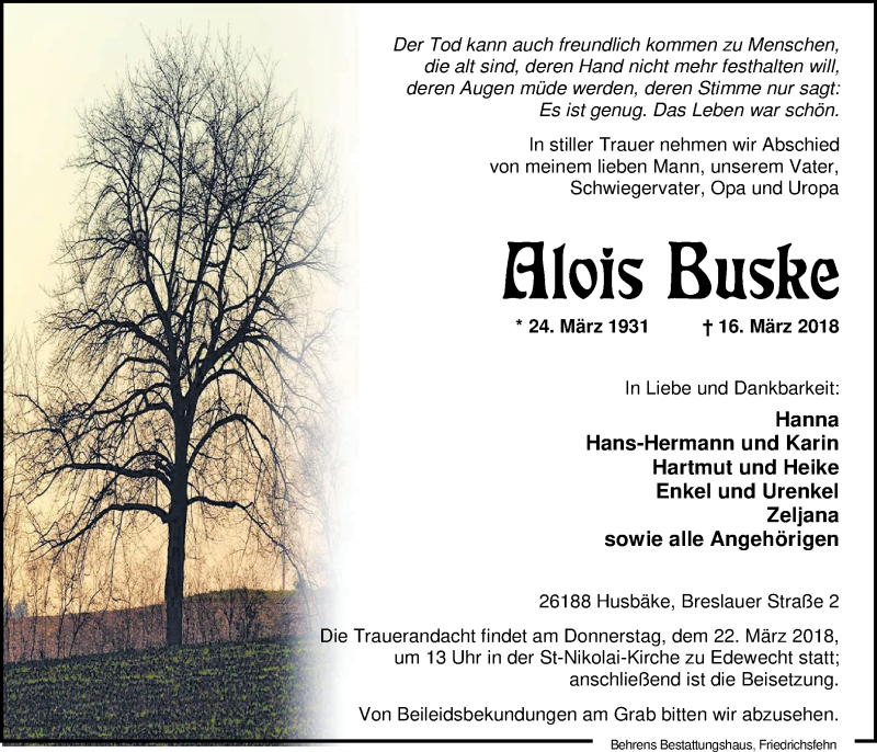 Hier finden Sie alle Traueranzeigen aus der Zeitung, die bisher für Alois Buske erschienen sind. Weitere Traueranzeigen, die in der Zeitung erscheinen, werden hier ebenfalls aufgelistet