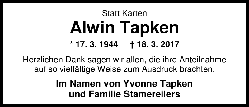 Hier finden Sie alle Traueranzeigen aus der Zeitung, die bisher für Alwin Tapken erschienen sind. Weitere Traueranzeigen, die in der Zeitung erscheinen, werden hier ebenfalls aufgelistet