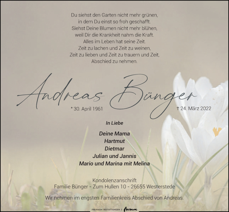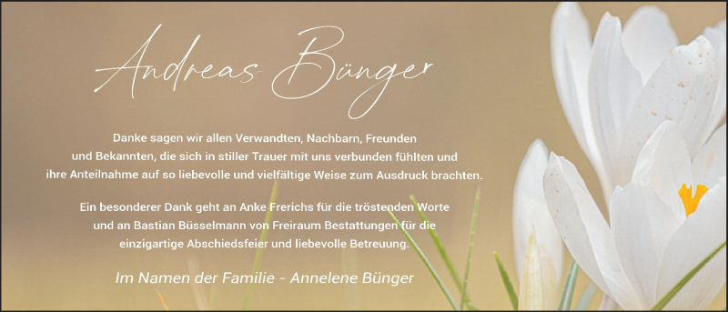 Hier finden Sie alle Traueranzeigen aus der Zeitung, die bisher für Andreas Bünger erschienen sind. Weitere Traueranzeigen, die in der Zeitung erscheinen, werden hier ebenfalls aufgelistet