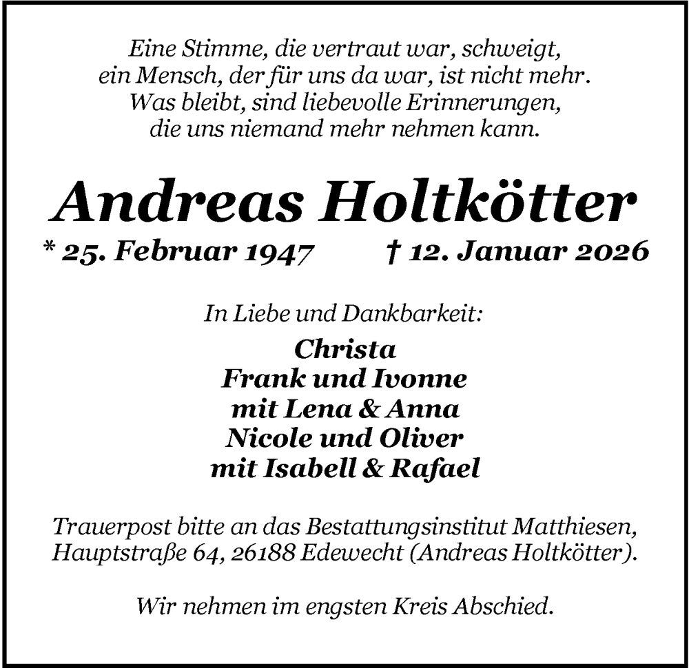 Hier finden Sie alle Traueranzeigen aus der Zeitung, die bisher für Andreas Holtkötter erschienen sind. Weitere Traueranzeigen, die in der Zeitung erscheinen, werden hier ebenfalls aufgelistet