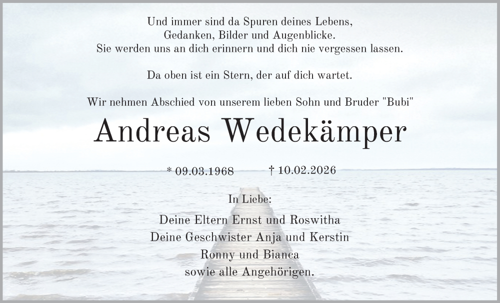 Hier finden Sie alle Traueranzeigen aus der Zeitung, die bisher für Andreas Wedekämper erschienen sind. Weitere Traueranzeigen, die in der Zeitung erscheinen, werden hier ebenfalls aufgelistet