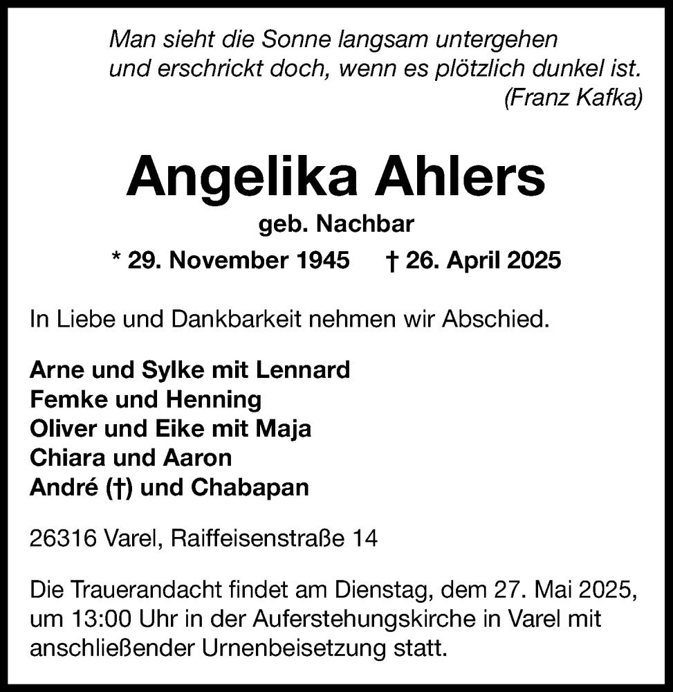 Hier finden Sie alle Traueranzeigen aus der Zeitung, die bisher für Angelika Ahlers erschienen sind. Weitere Traueranzeigen, die in der Zeitung erscheinen, werden hier ebenfalls aufgelistet