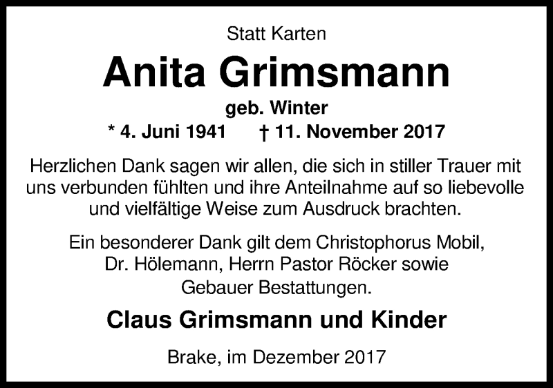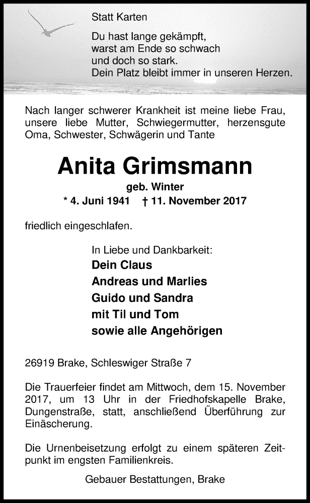 Hier finden Sie alle Traueranzeigen aus der Zeitung, die bisher für Anita Grimsmann erschienen sind. Weitere Traueranzeigen, die in der Zeitung erscheinen, werden hier ebenfalls aufgelistet
