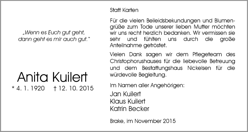 Hier finden Sie alle Traueranzeigen aus der Zeitung, die bisher für Anita Kuilert erschienen sind. Weitere Traueranzeigen, die in der Zeitung erscheinen, werden hier ebenfalls aufgelistet