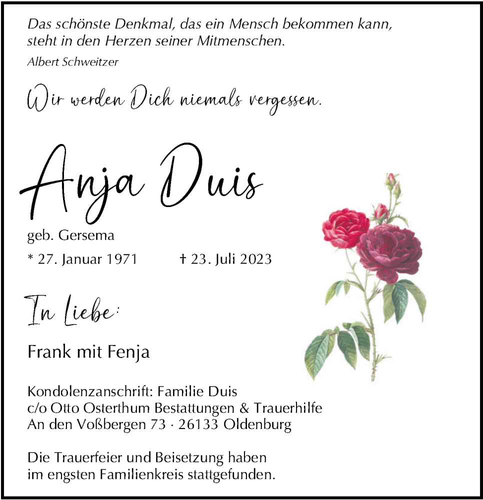 Hier finden Sie alle Traueranzeigen aus der Zeitung, die bisher für Anja Duis erschienen sind. Weitere Traueranzeigen, die in der Zeitung erscheinen, werden hier ebenfalls aufgelistet