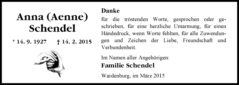 Hier finden Sie alle Traueranzeigen aus der Zeitung, die bisher für Anna (Aenne) Schendel erschienen sind. Weitere Traueranzeigen, die in der Zeitung erscheinen, werden hier ebenfalls aufgelistet