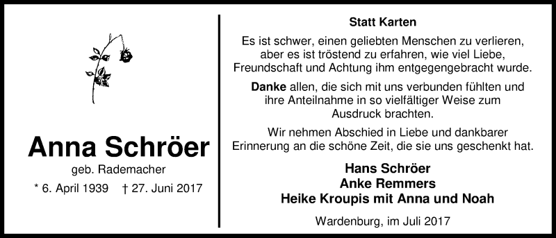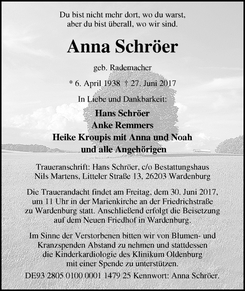 Hier finden Sie alle Traueranzeigen aus der Zeitung, die bisher für Anna Schröer erschienen sind. Weitere Traueranzeigen, die in der Zeitung erscheinen, werden hier ebenfalls aufgelistet