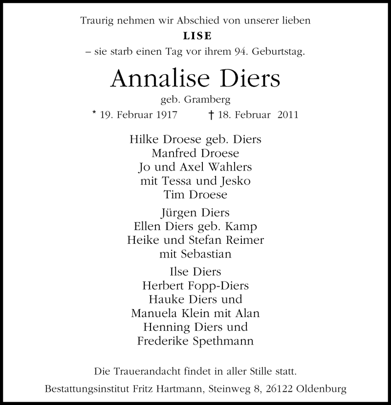 Hier finden Sie alle Traueranzeigen aus der Zeitung, die bisher für Annalise Diers erschienen sind. Weitere Traueranzeigen, die in der Zeitung erscheinen, werden hier ebenfalls aufgelistet