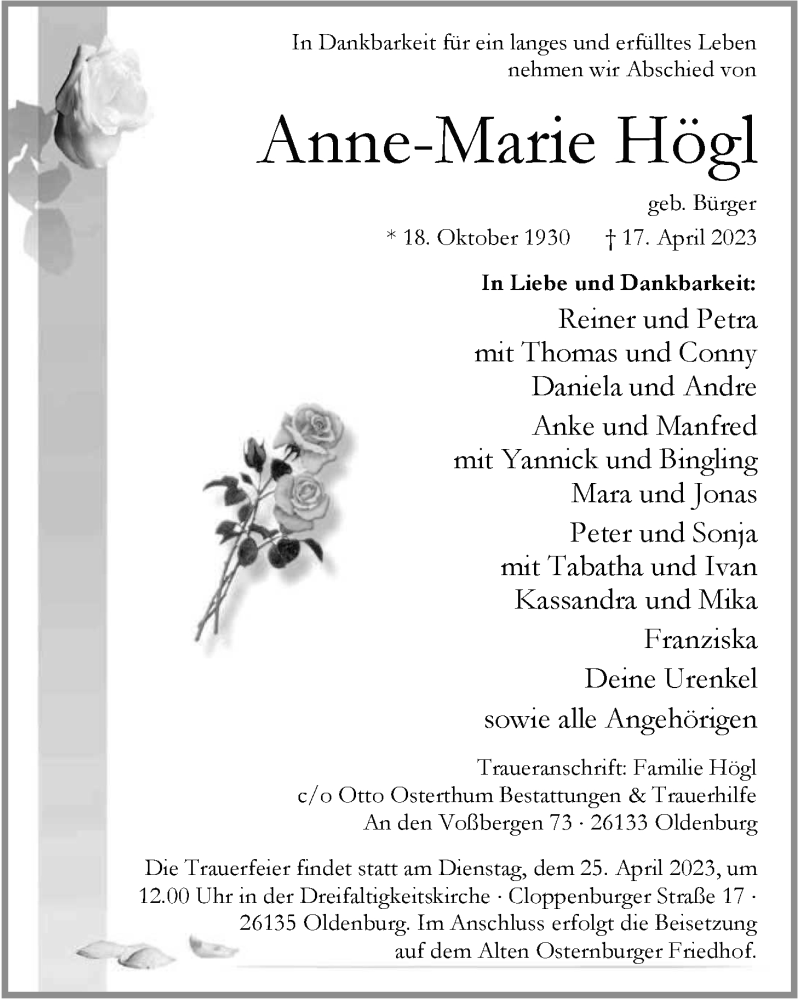 Hier finden Sie alle Traueranzeigen aus der Zeitung, die bisher für Anne-Marie Högl erschienen sind. Weitere Traueranzeigen, die in der Zeitung erscheinen, werden hier ebenfalls aufgelistet