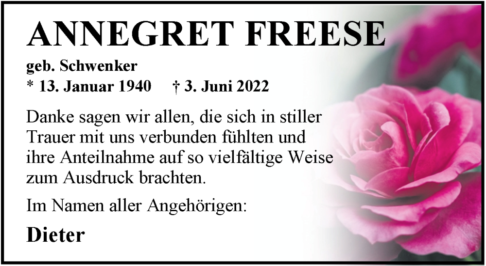 Hier finden Sie alle Traueranzeigen aus der Zeitung, die bisher für Annegret Freese erschienen sind. Weitere Traueranzeigen, die in der Zeitung erscheinen, werden hier ebenfalls aufgelistet