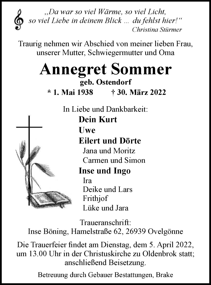 Hier finden Sie alle Traueranzeigen aus der Zeitung, die bisher für Annegret Sommer erschienen sind. Weitere Traueranzeigen, die in der Zeitung erscheinen, werden hier ebenfalls aufgelistet