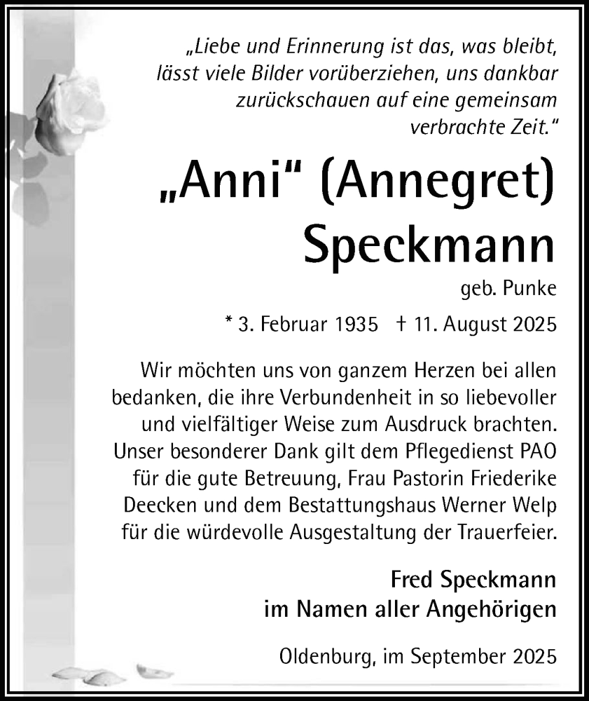 Hier finden Sie alle Traueranzeigen aus der Zeitung, die bisher für Annegret Speckmann erschienen sind. Weitere Traueranzeigen, die in der Zeitung erscheinen, werden hier ebenfalls aufgelistet