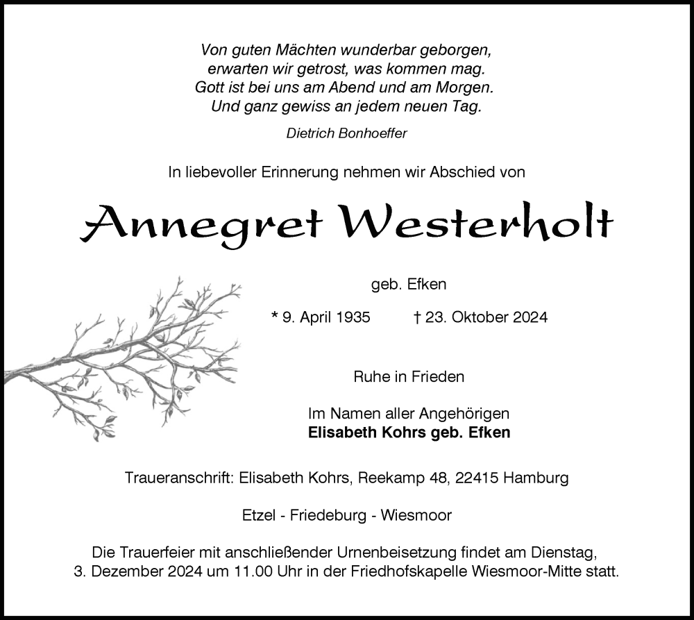 Hier finden Sie alle Traueranzeigen aus der Zeitung, die bisher für Annegret Westerholt erschienen sind. Weitere Traueranzeigen, die in der Zeitung erscheinen, werden hier ebenfalls aufgelistet