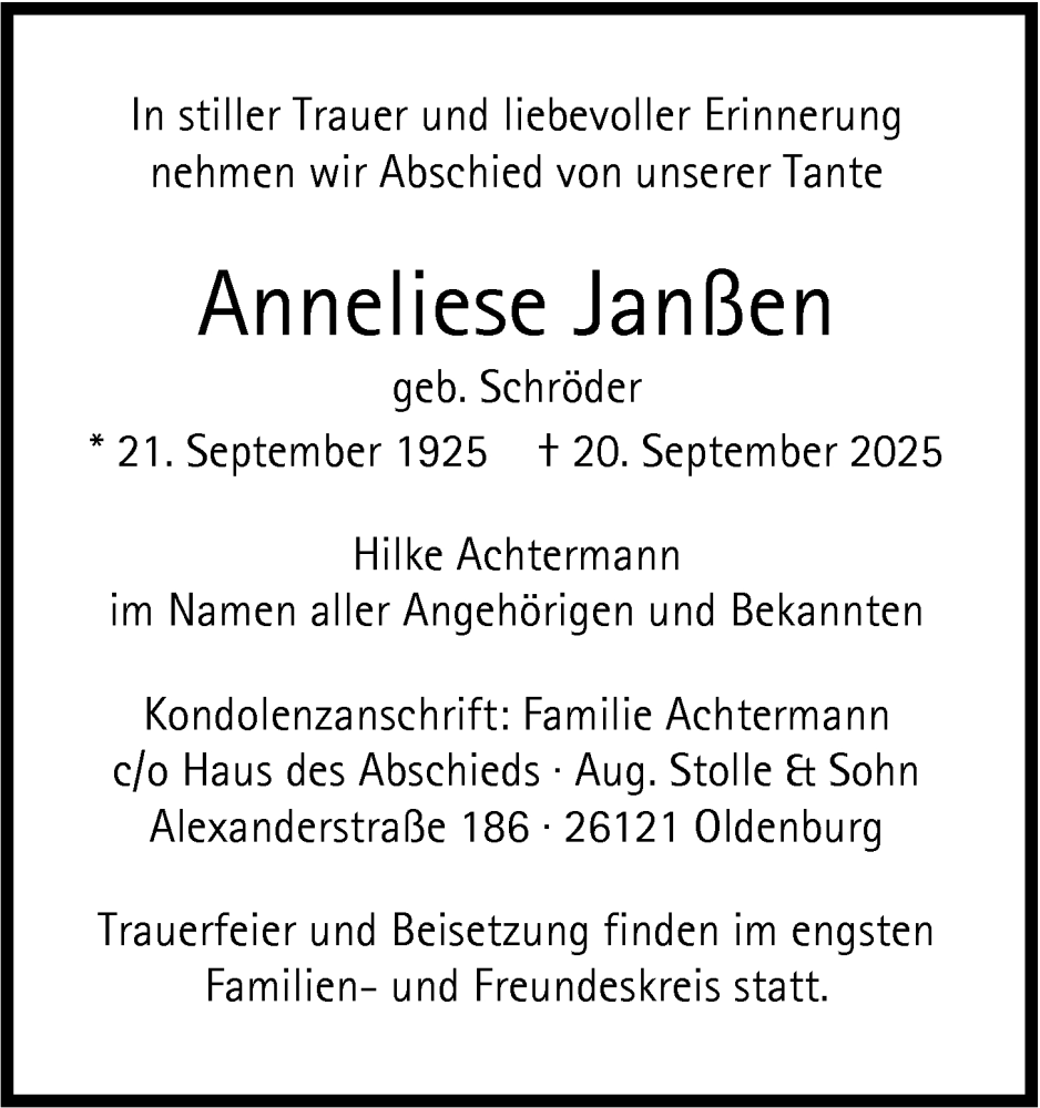 Hier finden Sie alle Traueranzeigen aus der Zeitung, die bisher für Anneliese Janßen erschienen sind. Weitere Traueranzeigen, die in der Zeitung erscheinen, werden hier ebenfalls aufgelistet