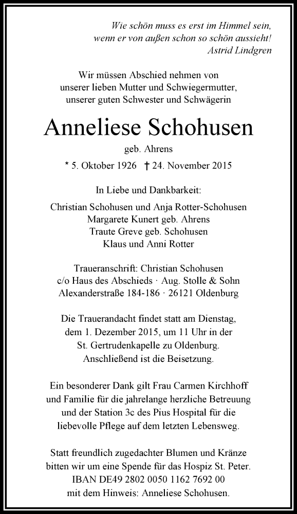 Hier finden Sie alle Traueranzeigen aus der Zeitung, die bisher für Anneliese Schohusen erschienen sind. Weitere Traueranzeigen, die in der Zeitung erscheinen, werden hier ebenfalls aufgelistet