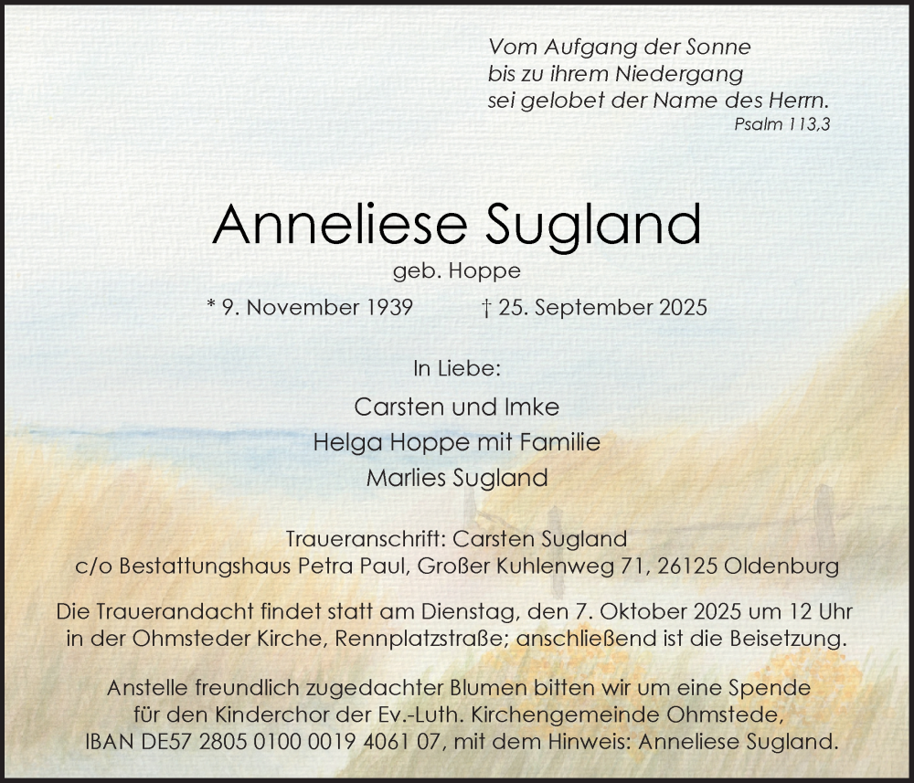 Hier finden Sie alle Traueranzeigen aus der Zeitung, die bisher für Anneliese Sugland erschienen sind. Weitere Traueranzeigen, die in der Zeitung erscheinen, werden hier ebenfalls aufgelistet