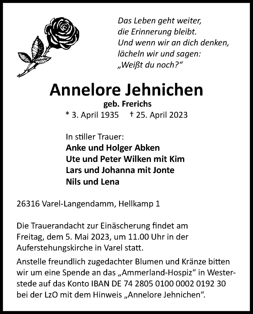 Hier finden Sie alle Traueranzeigen aus der Zeitung, die bisher für Annelore Jehnichen erschienen sind. Weitere Traueranzeigen, die in der Zeitung erscheinen, werden hier ebenfalls aufgelistet