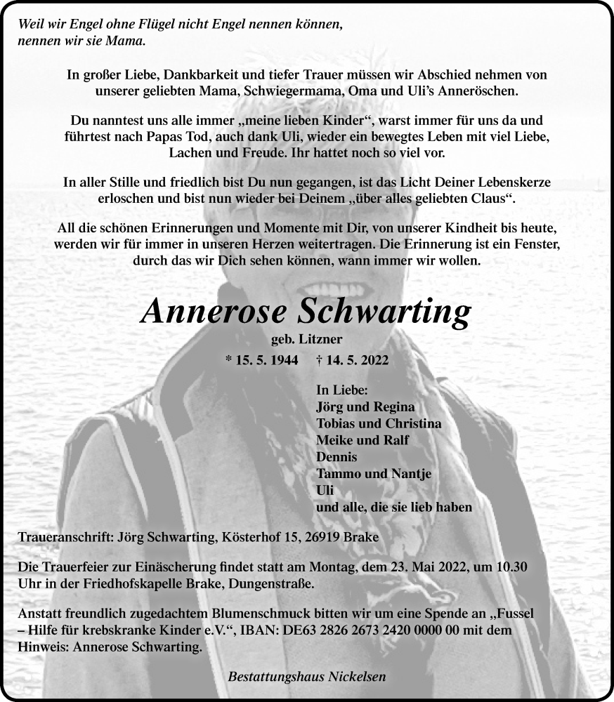 Hier finden Sie alle Traueranzeigen aus der Zeitung, die bisher für Annerose Schwarting erschienen sind. Weitere Traueranzeigen, die in der Zeitung erscheinen, werden hier ebenfalls aufgelistet