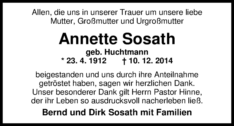 Hier finden Sie alle Traueranzeigen aus der Zeitung, die bisher für Annette Sosath erschienen sind. Weitere Traueranzeigen, die in der Zeitung erscheinen, werden hier ebenfalls aufgelistet