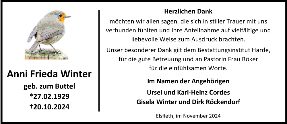 Hier finden Sie alle Traueranzeigen aus der Zeitung, die bisher für Anni Frieda Winter erschienen sind. Weitere Traueranzeigen, die in der Zeitung erscheinen, werden hier ebenfalls aufgelistet