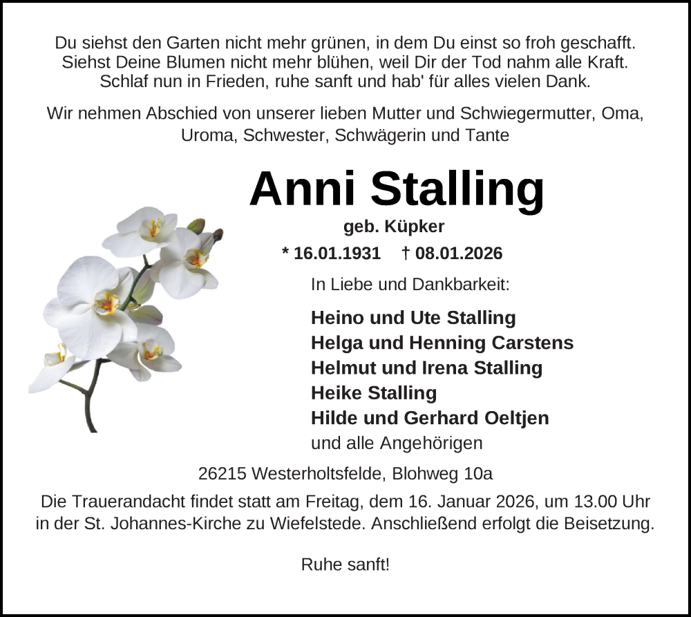 Hier finden Sie alle Traueranzeigen aus der Zeitung, die bisher für Anni Stalling erschienen sind. Weitere Traueranzeigen, die in der Zeitung erscheinen, werden hier ebenfalls aufgelistet