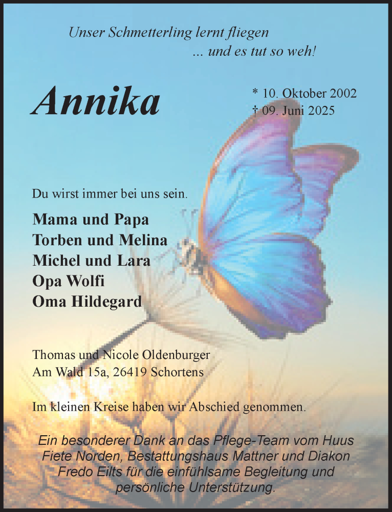 Hier finden Sie alle Traueranzeigen aus der Zeitung, die bisher für Annika Oldenburger erschienen sind. Weitere Traueranzeigen, die in der Zeitung erscheinen, werden hier ebenfalls aufgelistet
