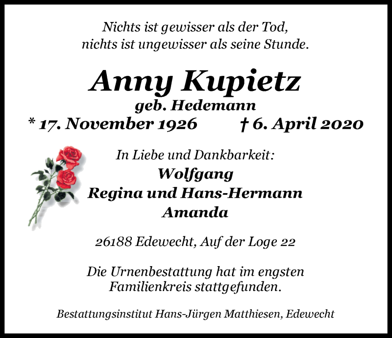 Hier finden Sie alle Traueranzeigen aus der Zeitung, die bisher für Anny Kupietz erschienen sind. Weitere Traueranzeigen, die in der Zeitung erscheinen, werden hier ebenfalls aufgelistet