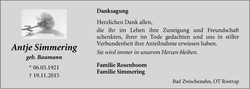 Hier finden Sie alle Traueranzeigen aus der Zeitung, die bisher für Antje Simmering erschienen sind. Weitere Traueranzeigen, die in der Zeitung erscheinen, werden hier ebenfalls aufgelistet