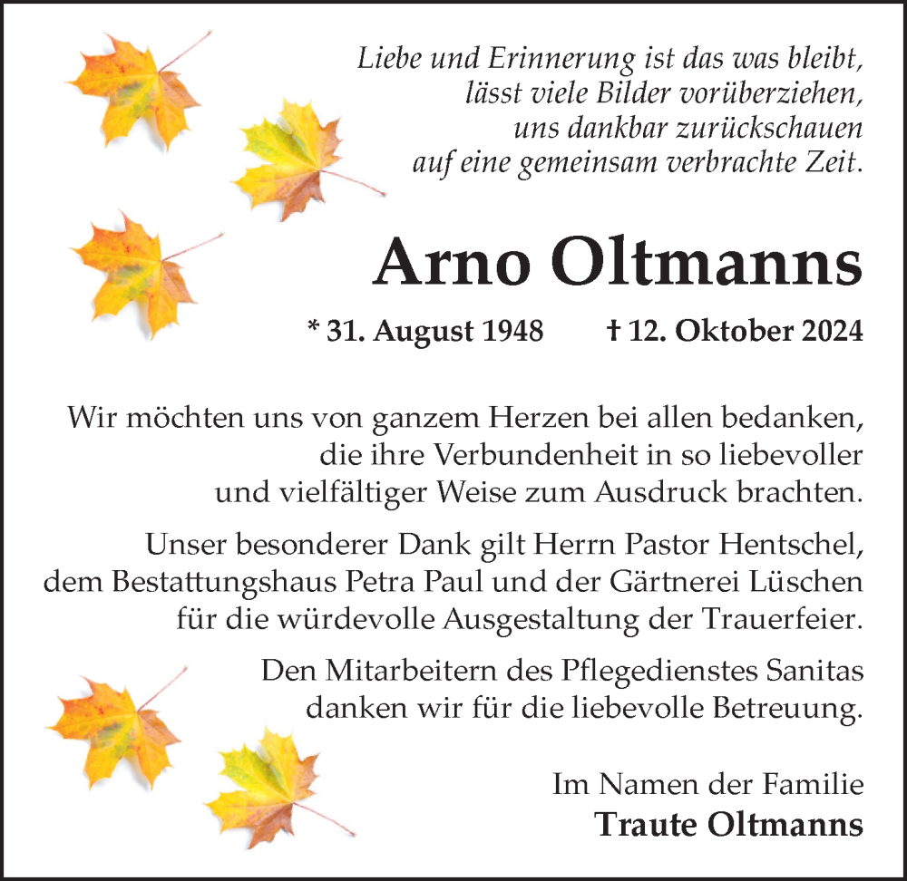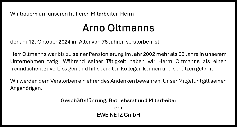 Hier finden Sie alle Traueranzeigen aus der Zeitung, die bisher für Arno Oltmanns erschienen sind. Weitere Traueranzeigen, die in der Zeitung erscheinen, werden hier ebenfalls aufgelistet