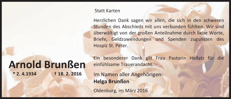 Hier finden Sie alle Traueranzeigen aus der Zeitung, die bisher für Arnold Brunßen erschienen sind. Weitere Traueranzeigen, die in der Zeitung erscheinen, werden hier ebenfalls aufgelistet