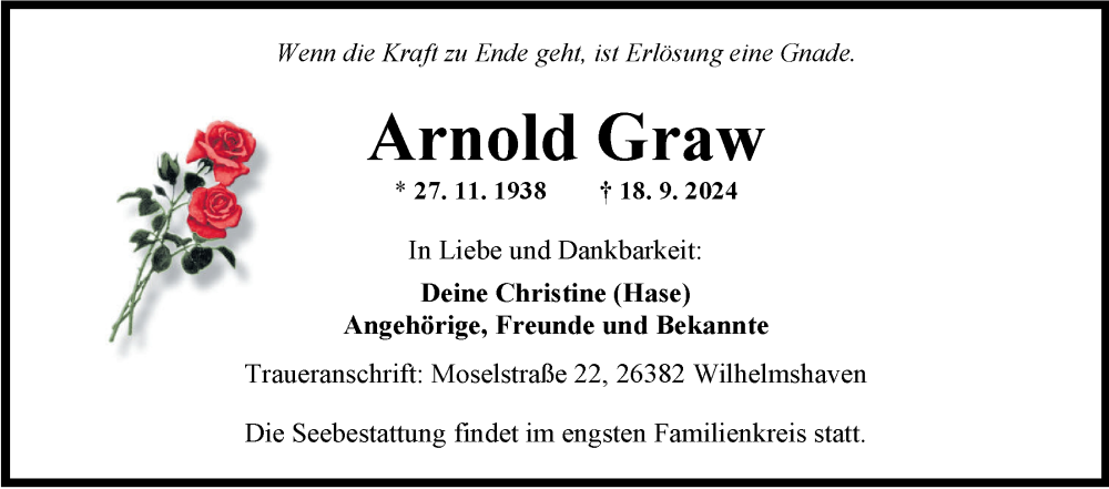 Hier finden Sie alle Traueranzeigen aus der Zeitung, die bisher für Arnold Graw erschienen sind. Weitere Traueranzeigen, die in der Zeitung erscheinen, werden hier ebenfalls aufgelistet