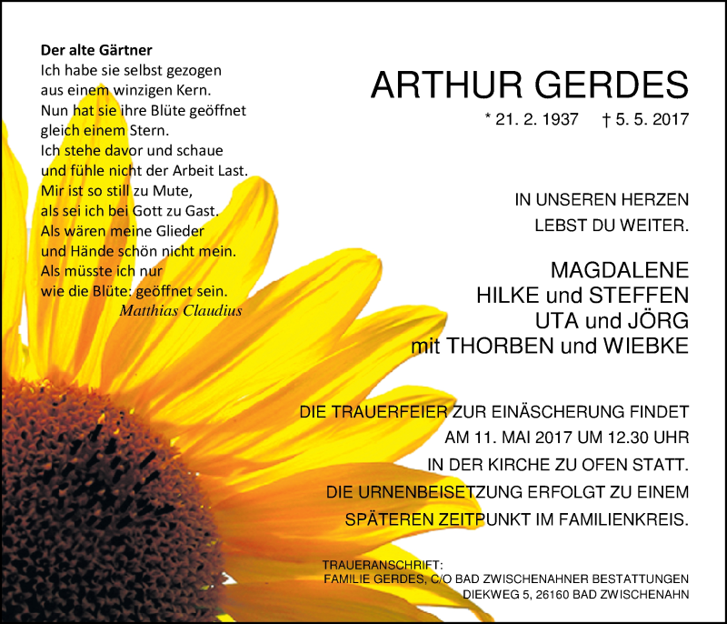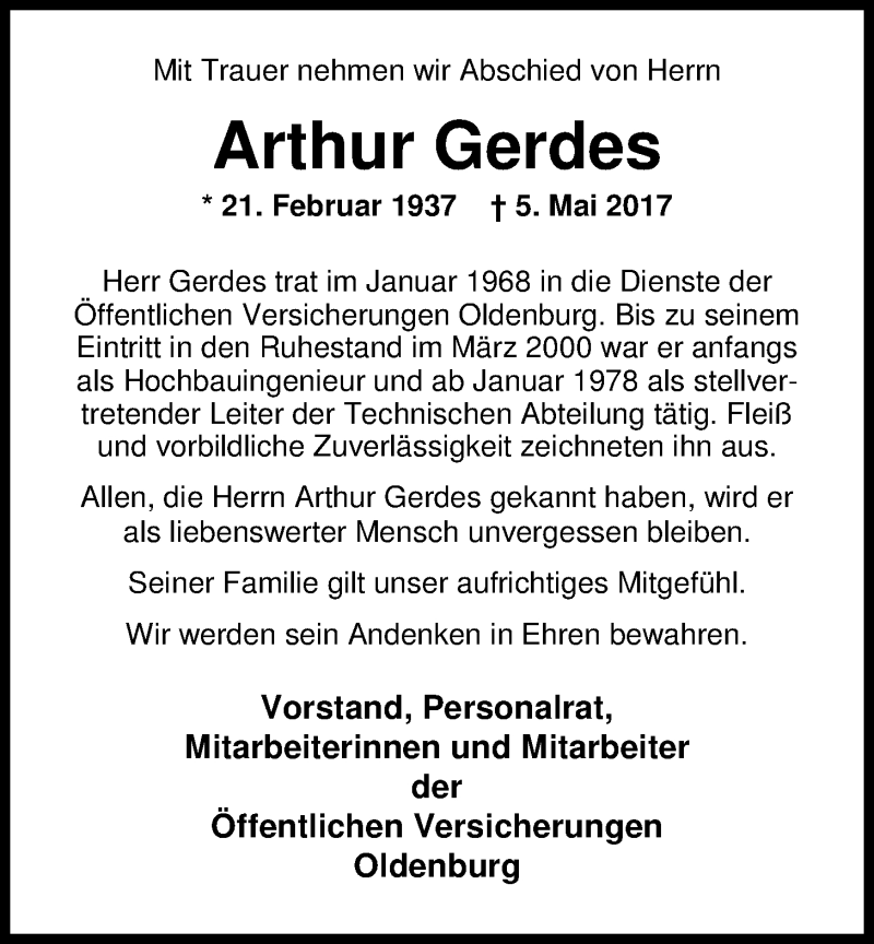 Hier finden Sie alle Traueranzeigen aus der Zeitung, die bisher für Arthur Gerdes erschienen sind. Weitere Traueranzeigen, die in der Zeitung erscheinen, werden hier ebenfalls aufgelistet