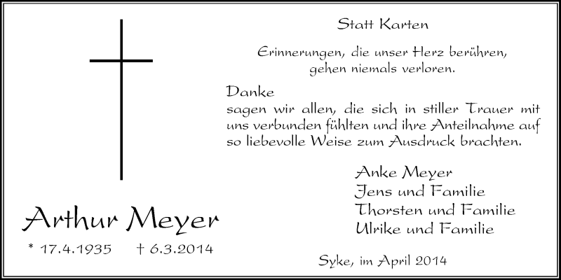 Hier finden Sie alle Traueranzeigen aus der Zeitung, die bisher für Arthur Meyer erschienen sind. Weitere Traueranzeigen, die in der Zeitung erscheinen, werden hier ebenfalls aufgelistet