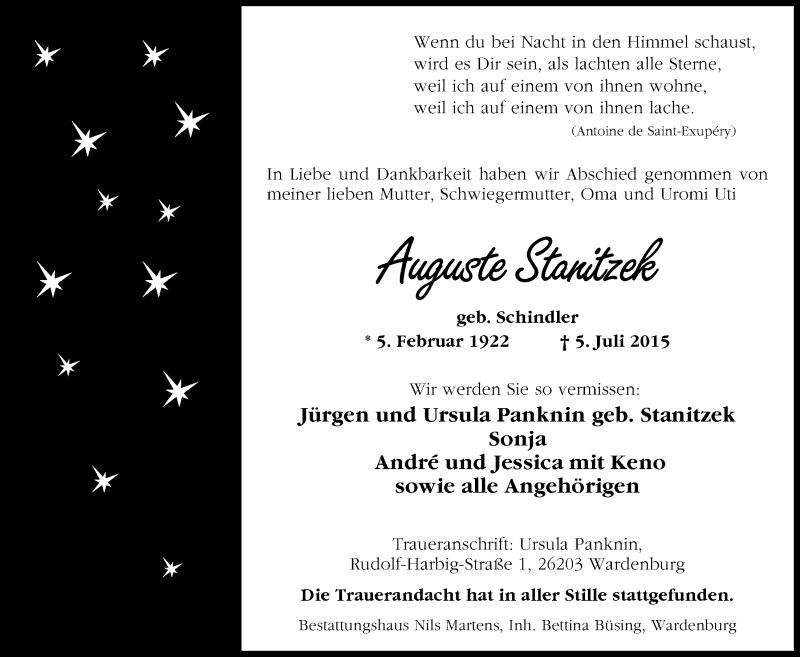 Hier finden Sie alle Traueranzeigen aus der Zeitung, die bisher für Auguste Stanitzek erschienen sind. Weitere Traueranzeigen, die in der Zeitung erscheinen, werden hier ebenfalls aufgelistet