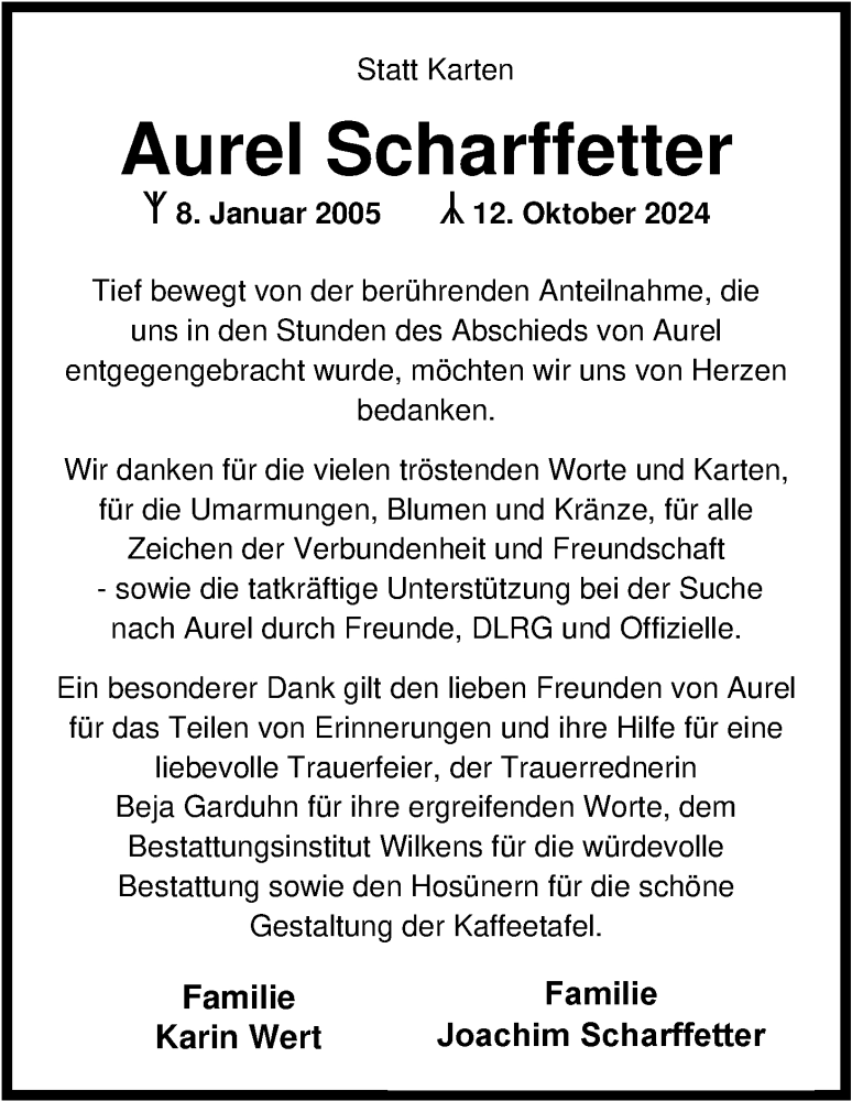 Hier finden Sie alle Traueranzeigen aus der Zeitung, die bisher für Aurel Scharffetter erschienen sind. Weitere Traueranzeigen, die in der Zeitung erscheinen, werden hier ebenfalls aufgelistet