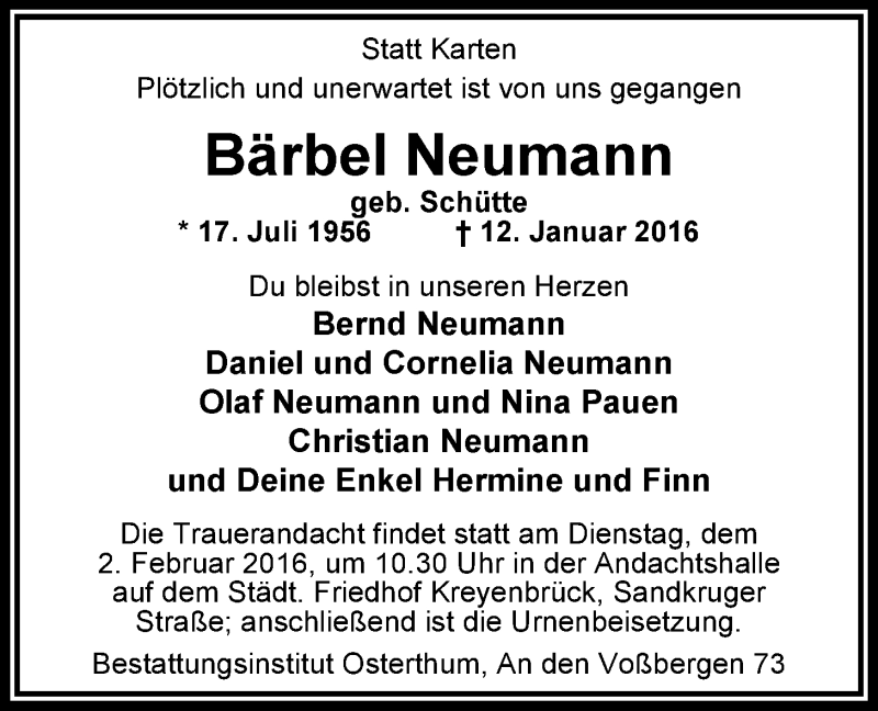 Hier finden Sie alle Traueranzeigen aus der Zeitung, die bisher für Bärbel Neumann erschienen sind. Weitere Traueranzeigen, die in der Zeitung erscheinen, werden hier ebenfalls aufgelistet