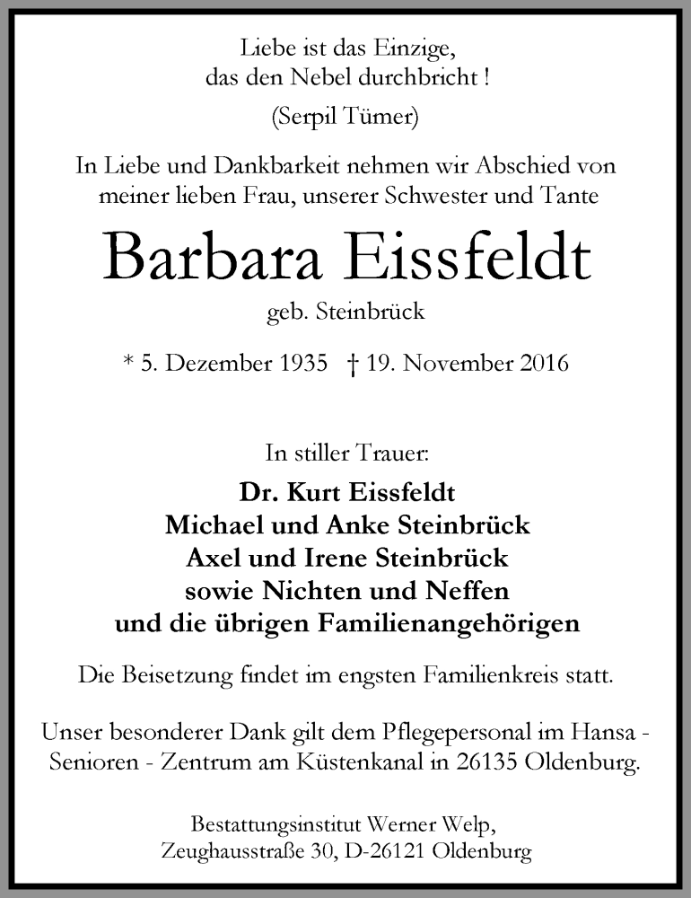 Hier finden Sie alle Traueranzeigen aus der Zeitung, die bisher für Barbara Eissfeldt erschienen sind. Weitere Traueranzeigen, die in der Zeitung erscheinen, werden hier ebenfalls aufgelistet